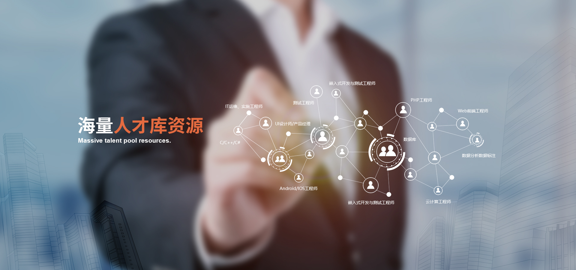 擁有超10萬以上的人才儲備;包括專家級、、資深級、高級、中級等各技術崗位,能滿足客戶快速用人的需求
